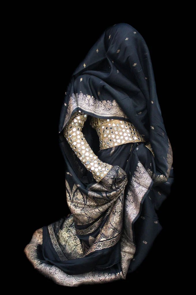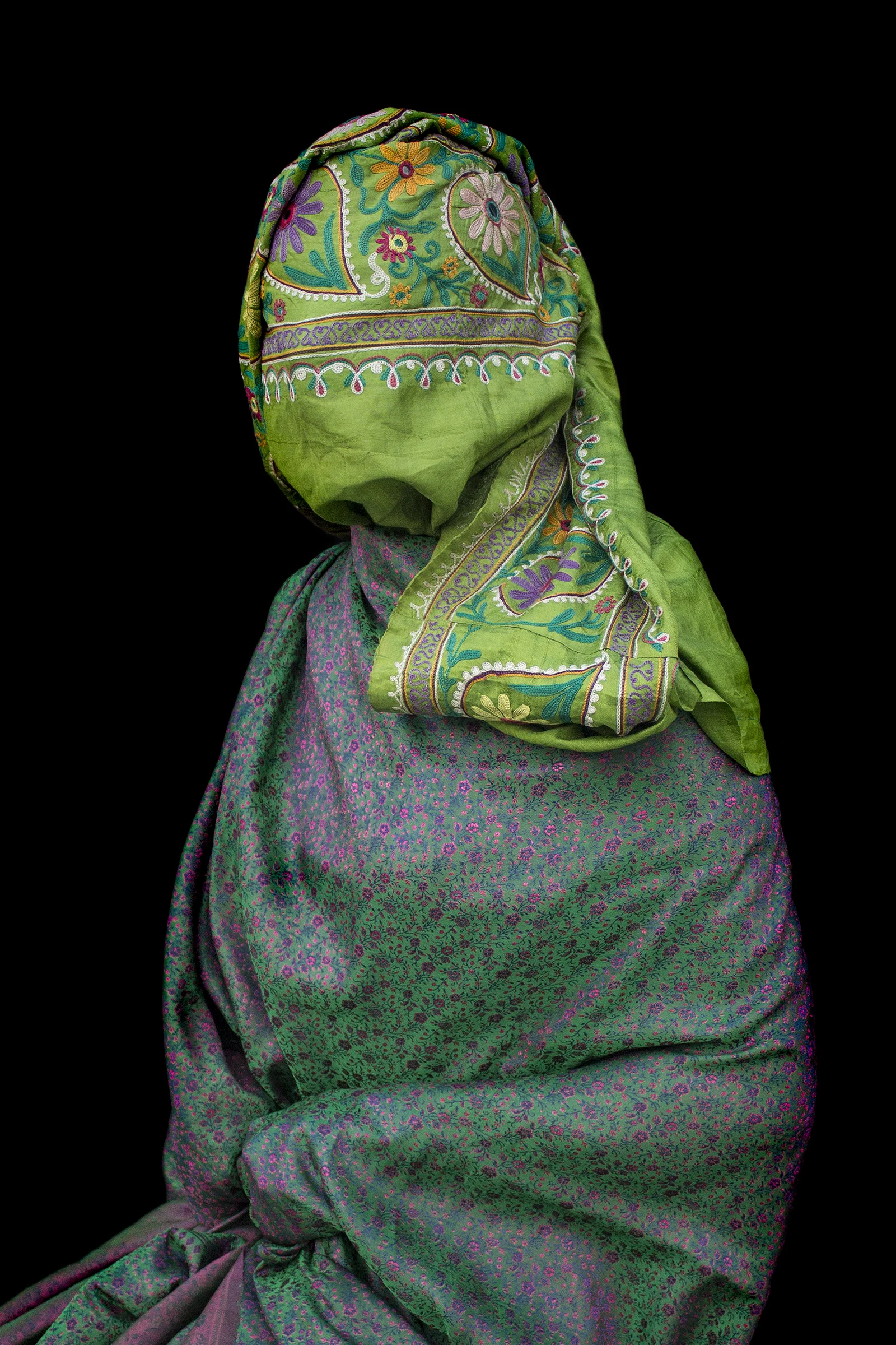 Instead of focusing on borders that divide peoples and cultures, Ali’s attention is turned towards the places where cultures overlap. “I would argue that while man-made borders divide people, they do not necessarily divide culture; borders, in and of themselves, are cultural,” explains Ali. Borders are cultural as they separate one culture from another, creating dividing lines. Through BORDERLAND, Ali acknowledges that borders exist everywhere, whether they are manmade or naturally occurring. Borders can confine and block access, breaking communities and creating an ethos of fear and violence. “All these [borders] lend to an erasure of all that was,” adds Ali, “An erasure of what we see in these textiles. To me, communities that have a rich oral history express their stories and heritage through objects such as textiles.” Each piece of fabric tells a story of evolution, documenting the influences and histories of the cultures that led to its production. In fact, the word text comes from textiles, meaning ‘woven.’ However, as Ali explains: “Over time, those who wrote history were the ones who formed history; they are also the ones who form the perspective in which other societies are seen. So when we are discussing borders and societies with an oral tradition rather than a literary one, it is clear that these societies and cultures are misunderstood and seen through their suffering and their existence on these geographic physical frontiers, rather than through their beauty and knowledge developed over time.” Thus, the figures in BORDERLAND are ‘location-less.’ There are no identifying landmarks, no landscapes or objects in the background to enable the viewer to easily locate the subjects. The only markers of identity are the textiles that cover every inch of each sitter’s body.